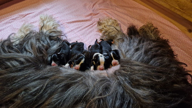 Synnytys sujui jouhevasti ja Pipsa huolehtii pennuista hienosti. Pientä jännitystä tiistaiaamuun toi se, että synnytys vaikutti loppuneen ja mami pentuineen vaikutti tyytyväisiltä, vaikka seitsemättä pentua ei kuulunut. Kävimme eläinlääkärissä tarkistuttamassa tilanteen, ja tiineysröntgenissä povattu seitsemäs pentu osoittautui laskuvirheeksi, joten koko köörillä kaikki hyvin.
